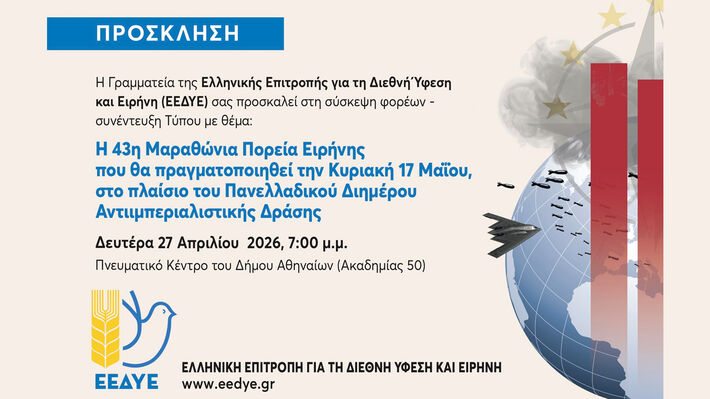 Σε σύσκεψη φορέων και συνέντευξη Τύπου τη Δευτέρα 27 Απρίλη, στις 7 μ.μ. στο Πνευματικό Κέντρο του Δήμου Αθηναίων (Ακαδημίας 50) καλεί η Γραμματεία της Ελληνικής Επιτροπής για τη Διεθνή Ύφεση και Ειρήνη (ΕΕΔΥΕ).