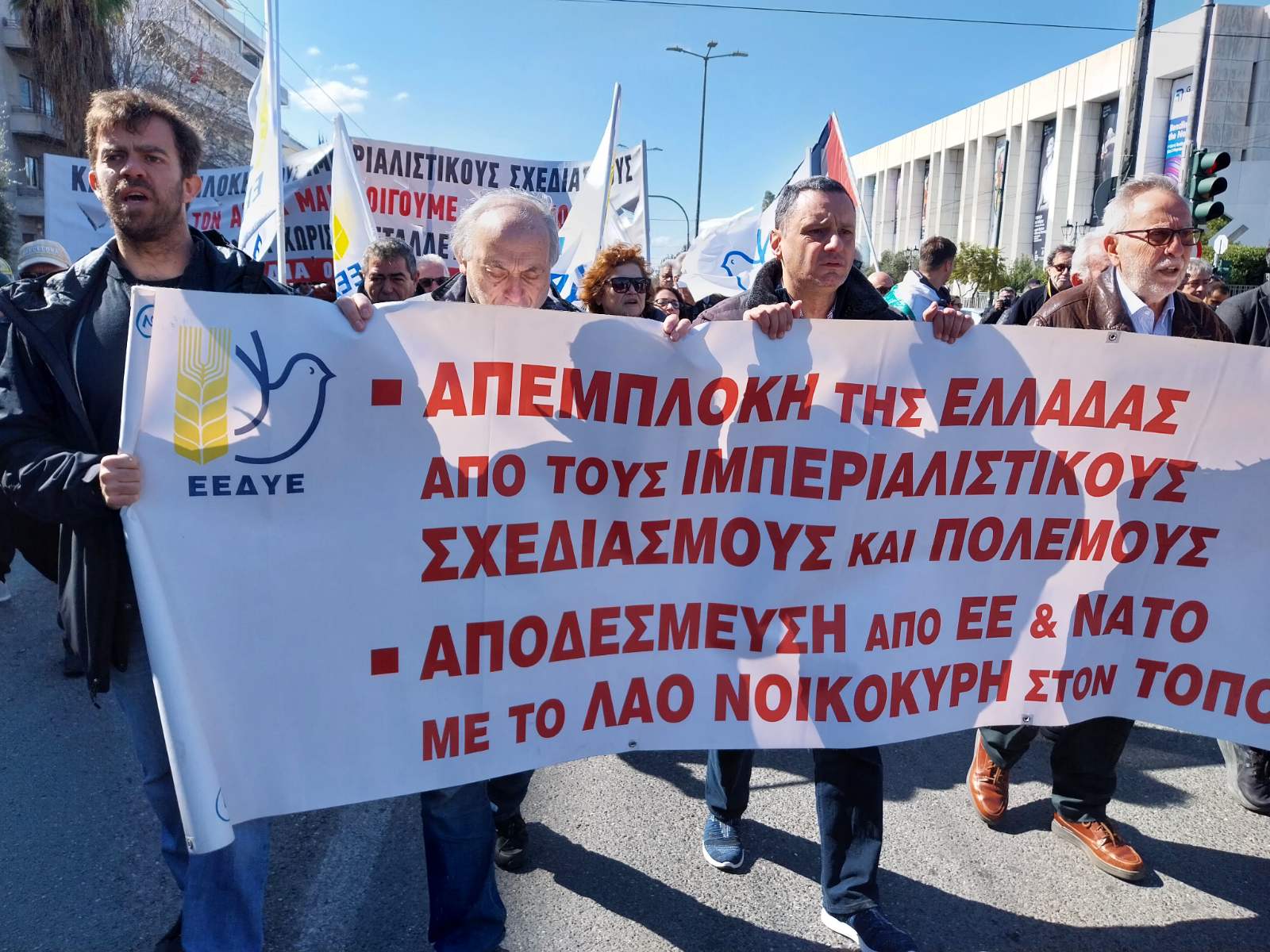 Έξω από την Αμερικάνικη πρεσβεία τα συνθήματα δυνάμωσαν: «Οι ιμπεριαλιστές τη γη ξαναμοιράζουν, με των λαών το αίμα τα σύνορα χαράζουν» και «Διέξοδο στον πόλεμο θα δώσει ο λαός, ανίκητος δεν είναι ο ιμπεριαλισμός», δίνοντας με αυτό το τελευταίο το στίγμα, για την μόνη πραγματική διέξοδο για τους λαούς, μπροστά στον όλεθρο που σπέρνουν οι ιμπεριαλιστές.