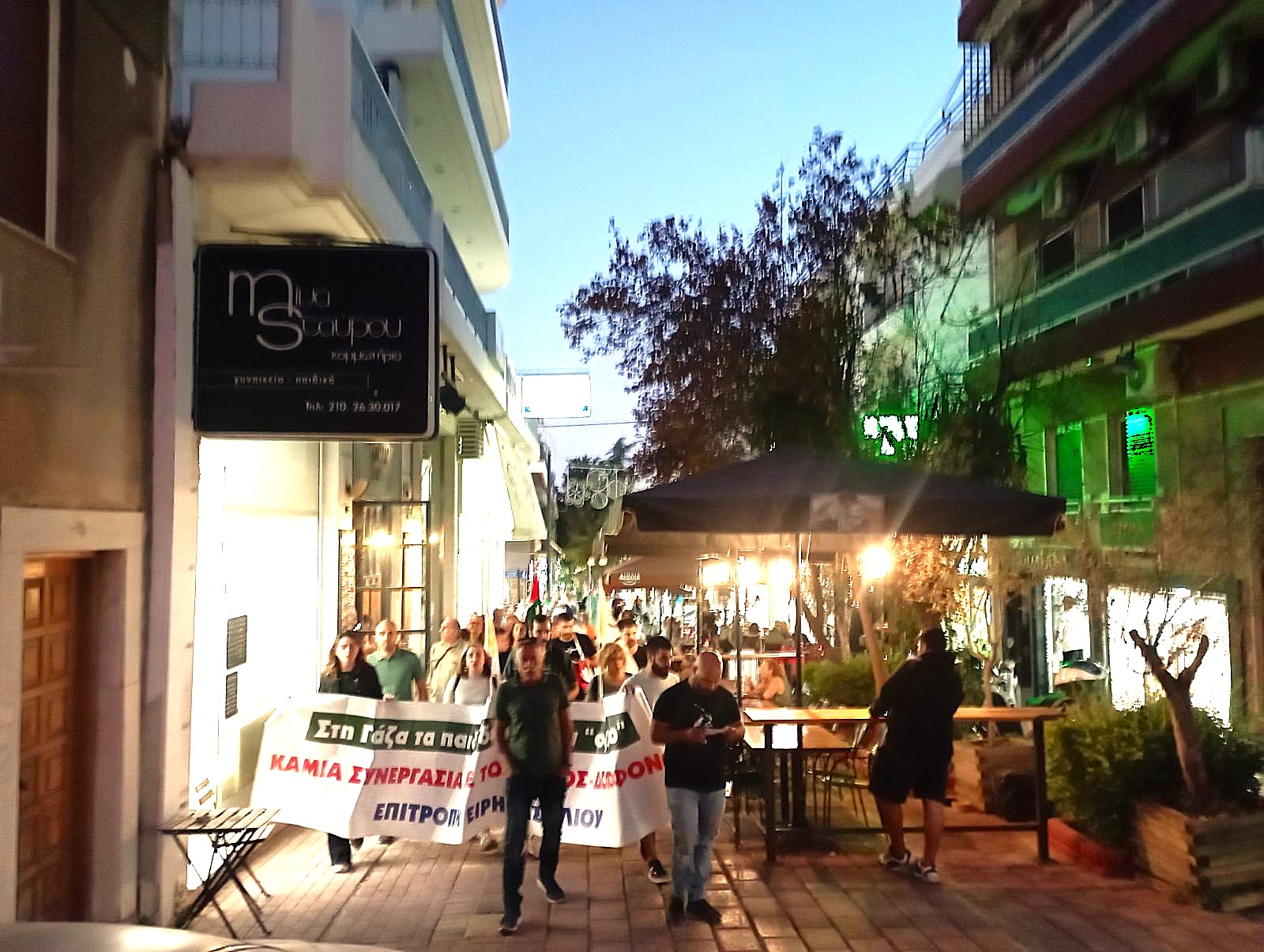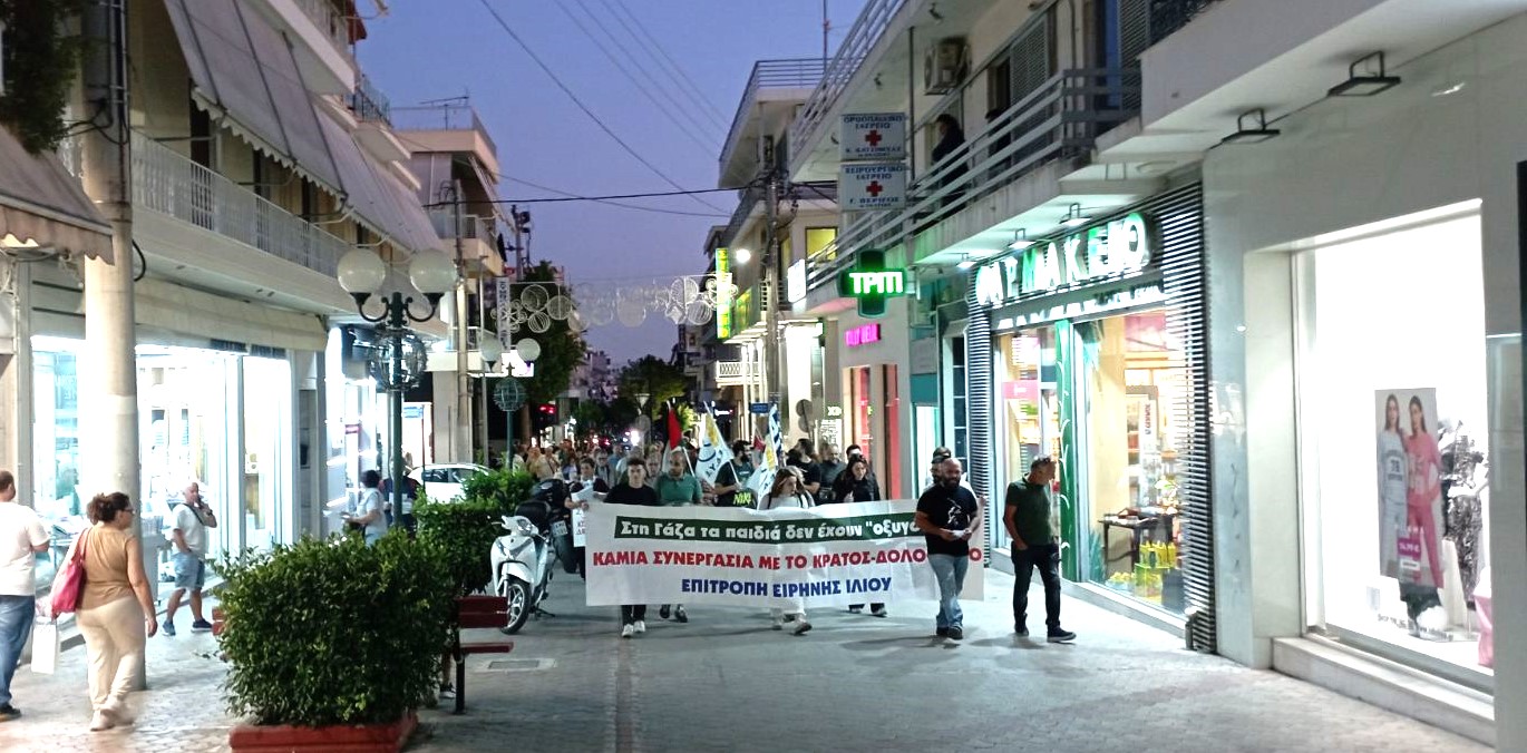 Έκτακτη κινητοποίηση πραγματοποιήθηκε την παρασκευή 19/9 το βράδυ στο Ίλιον, από την Επιτροπή Ειρήνης και τον σύλλογο γυναικών Ιλίου, απαιτώντας: να σταματήσει τώρα η νέα σφαγή στη Γάζα, καμία στήριξη στο κράτος δολοφόνο του Ισραήλ, να εφαρμοστεί άμεσα η ομόφωνη απόφαση της βουλής για την αναγνώριση ανεξάρτητου Παλαιστινιακού κράτους.