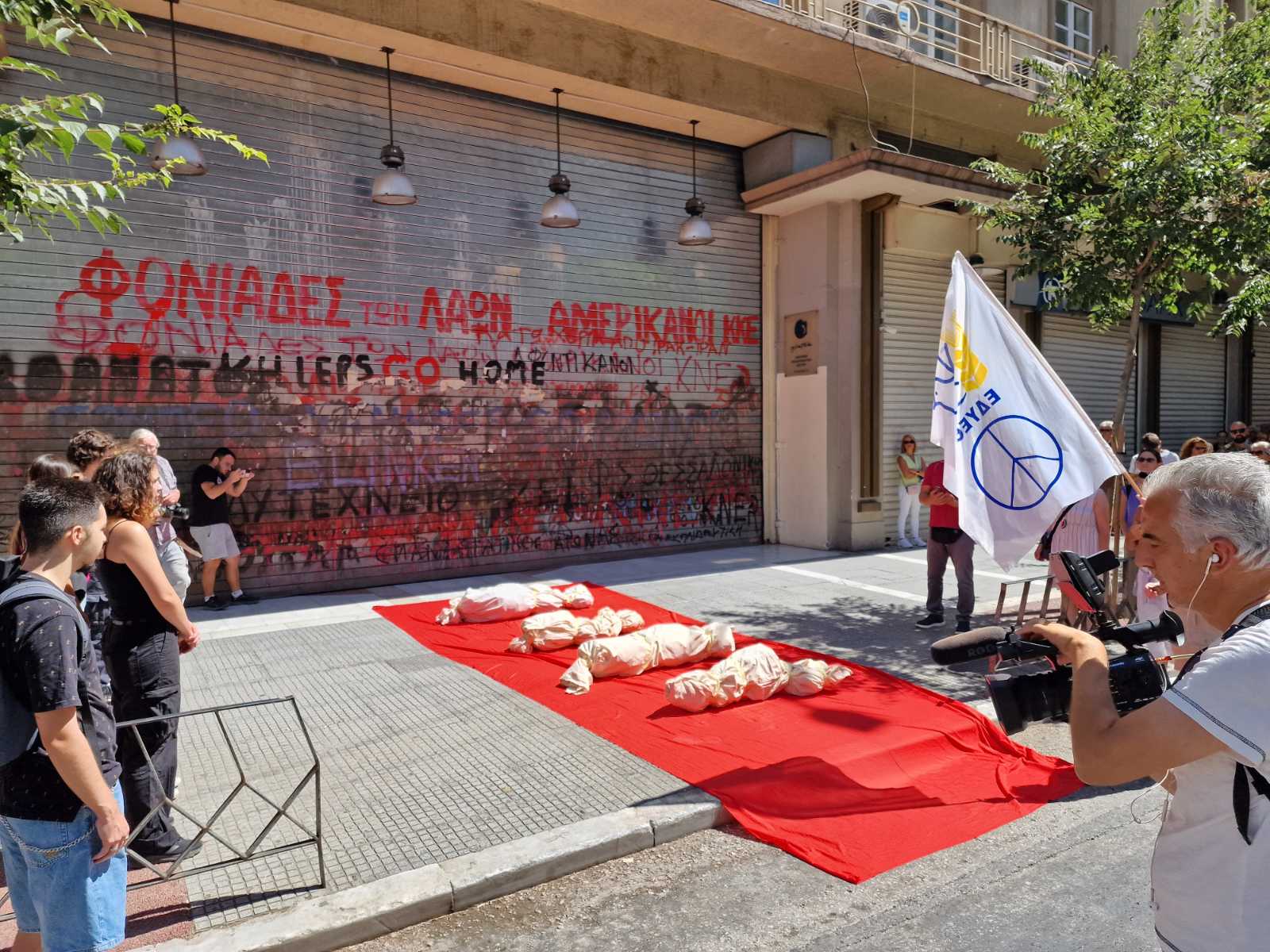 Στην κεφαλή της πορείας ήταν μια μεγάλη παλαιστινιακή σημαία, ακολουθούσαν νέοι που κρατούσαν συμβολικά τα πτώματα γυναικών και παιδιών τυλιγμένα σε σεντόνια και αμέσως μετά υπήρχε ένα μεγάλο κόκκινο πανί που συμβόλιζε τα ποτάμια αίματος που χύνονται στους ιμπεριαλιστικούς πολέμους.