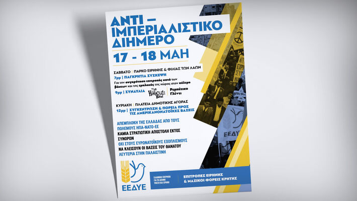 Οι Επιτροπές Ειρήνης της Κρήτης (μέλη της ΕΕΔΥΕ) διοργανώνουν το Σάββατο στις 17 και την Κυριακή στις 18 Μαΐου, διήμερο αντιιμπεριαλιστικής και αντιπολεμικής δράσης με την συμμετοχή δεκάδων σωματείων, συλλόγων και φορέων του νησιού διεκδικώντας: