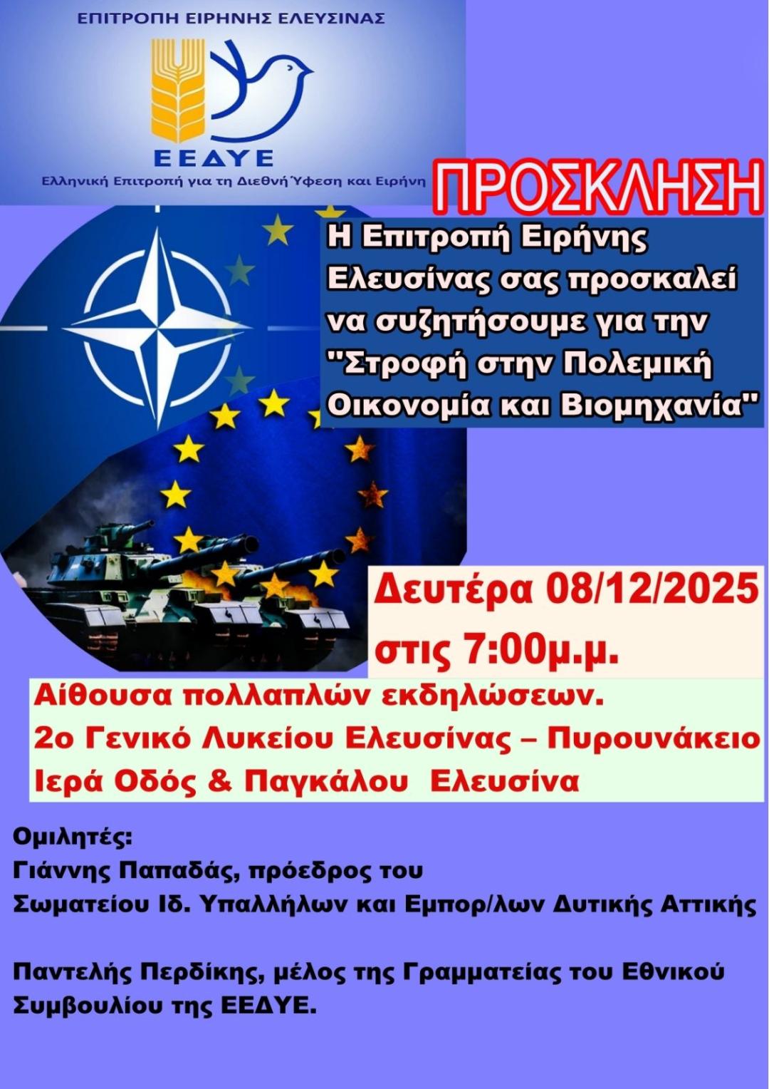 Η Επιτροπή Ειρήνης Ελευσίνας σας προσκαλεί να συζητήσουμε για την “Στροφή στην Πολεμική Οικονομία και Βιομηχανία”
