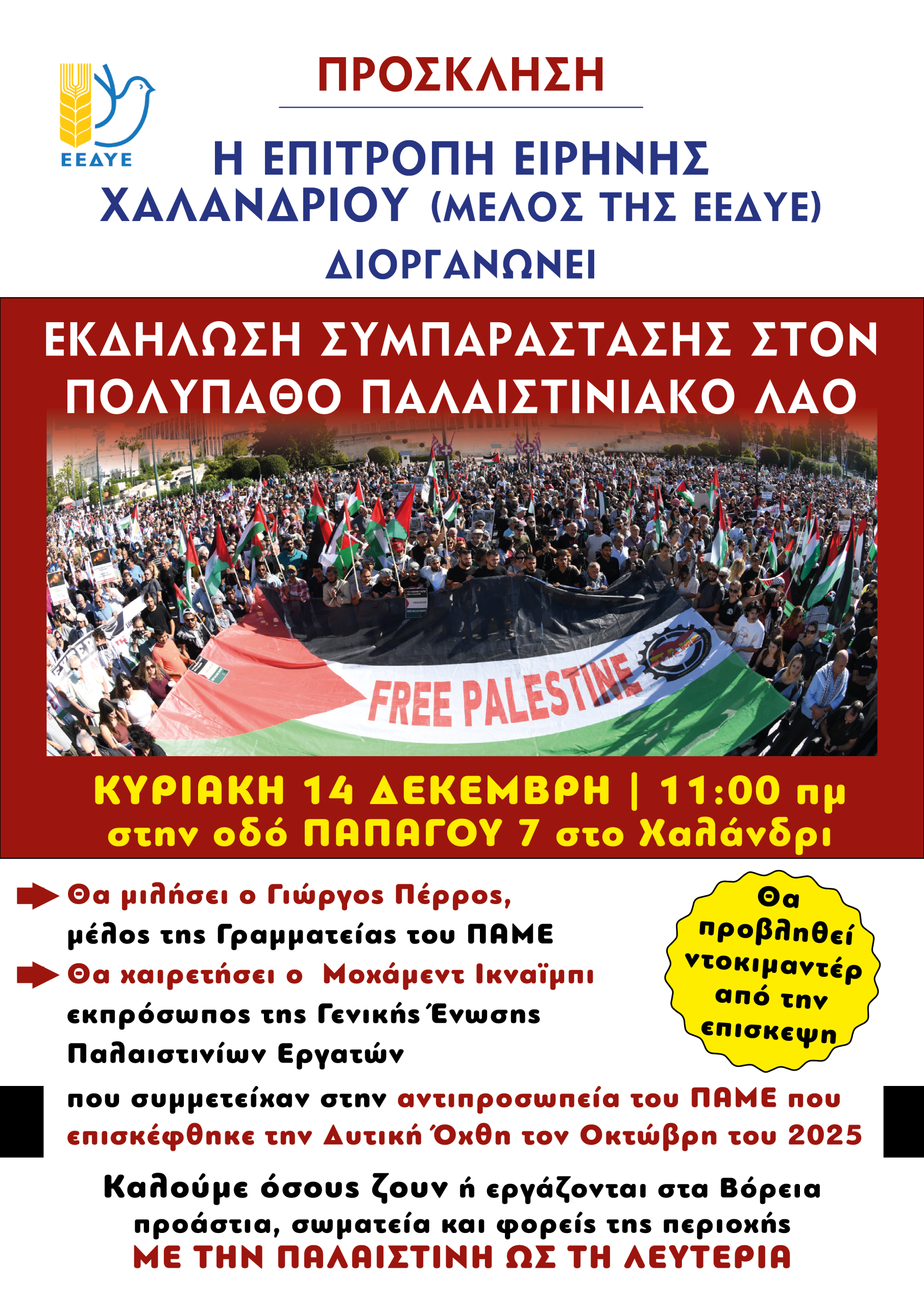 Εκδήλωση Συμπαράστασης στον Παλαιστινιακό Λαότην Κυριακή 14/12, στις 11:00, στην Οδό Παπάγου 7 στο Χαλάνδρι. Θα μιλήσει ο Γιώργος Πέρρος, μέλος της Γραμματείας του ΠΑΜΕ και ο Μοχάμεντ Ιγκναίμπι, εκπρόσωπος της Γενικής Ένωσης Παλαιστινίων Εργατών.