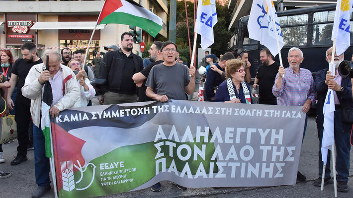 «Αλληλεγγύη στον ηρωικό λαό της Παλαιστίνης. Να σταματήσει τώρα η γενοκτονία. Λευτεριά στην Παλαιστίνη».