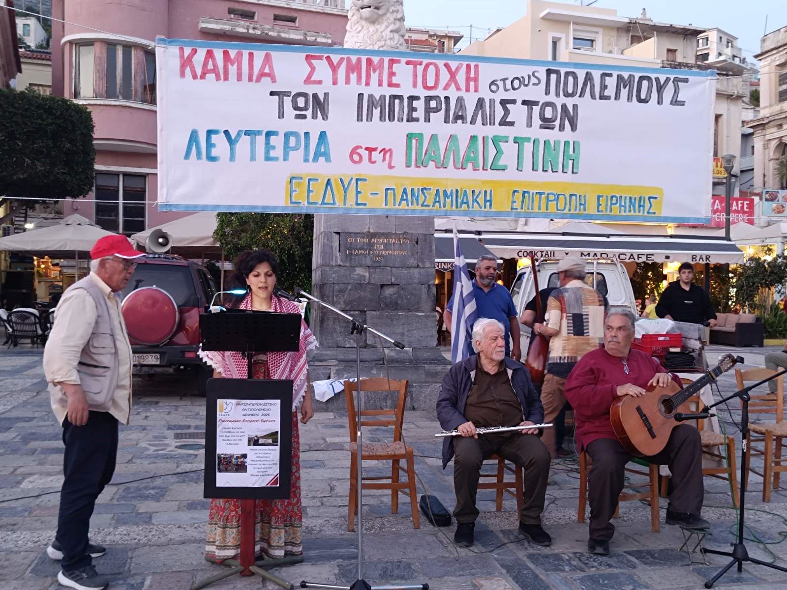 Ακολούθησε ομιλία από την πρόεδρο της Π.Ε.Ε Ρούλα Στεφανάκη μέλος του Εθνικού Συμβουλίου της ΕΕΔΥΕ , η οποία αναφέρθηκε στα πολεμοκάπηλα σχέδια του ΝΑΤΟ και της Ε.Ε με τους τεράστιους πόρους προς τη λεγόμενη «πολεμική οικονομία» ενώ υπογράμμισε τις ευθύνες της ελληνικής κυβέρνησης ως πρωτοπαλίκαρου του ιμπεριαλισμού στη περιοχή που κόβει δαπάνες από τις ανάγκες του λαού για να δώσει ακόμη 25 δις για ΝΑΤΟϊκούς εξοπλισμούς. Κατάγγειλε τα παζάρια για το Αιγαίο, την Κύπρο και την Ανατολική Μεσόγειο και τους κινδύνους που αυτά εγκυμονούν για την ειρήνη στη περιοχή. Εξέφρασε ακόμη μια φορά την αλληλεγγύη του ελληνικού λαού στη Παλαιστίνη και καταδίκασε την συμμαχία της Ελλάδας με το κράτος – δολοφόνο του Ισραήλ.