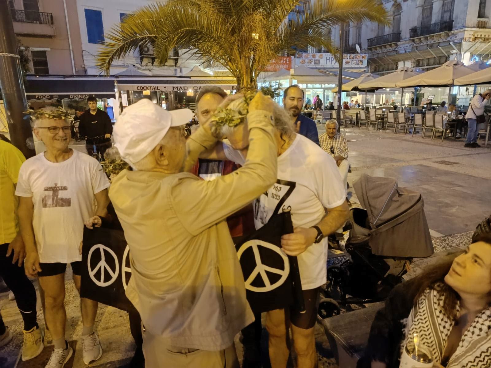 Αμέσως μετά, ιδιαίτερα συγκινητική ήταν η στιγμή του τερματισμού των ειρηνοδρόμων Θανάση Κονταξή, Δημήτρη Καραγεωργίου, Νίκης Καραγεωργίου, Σάκη Νιώτη και Διόνυσου Νιώτη που έτρεξαν στη διαδρομή Πυθαγόρειο – Βαθύ και οι οποίοι βραβεύτηκαν με στεφάνια ελιάς που επιμελήθηκε η πρόεδρος του παραρτήματος της ΠΕΑΕΑ Κούλα Καραμηνά – Πόθου.