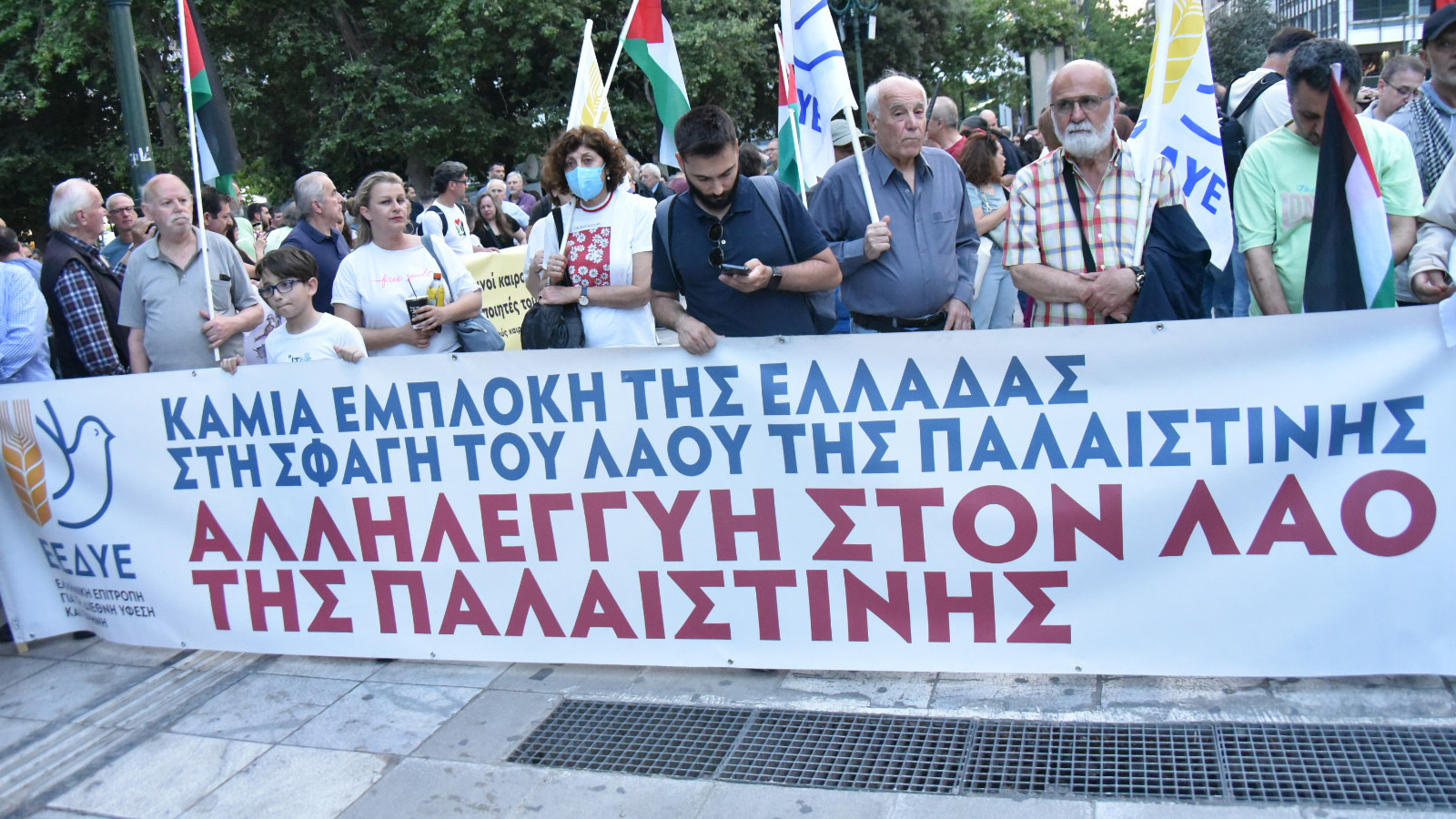 Το σύνθημα «Λευτεριά στη Παλαιστίνη» δονεί διαρκώς την ατμόσφαιρα στη πλατεία Συντάγματος στη συναυλία αλληλεγγύης στον Παλαιστινιακό λαό.