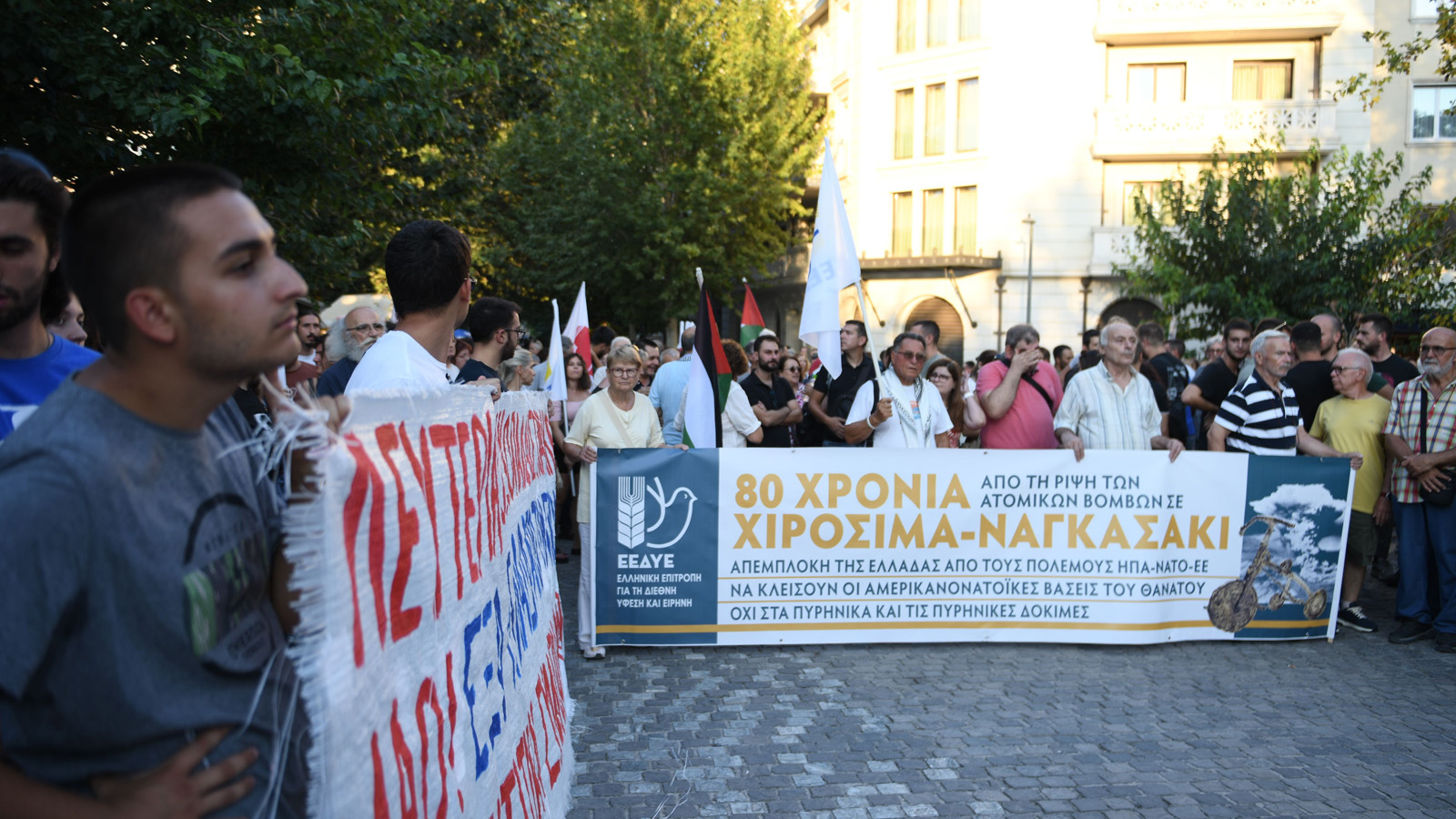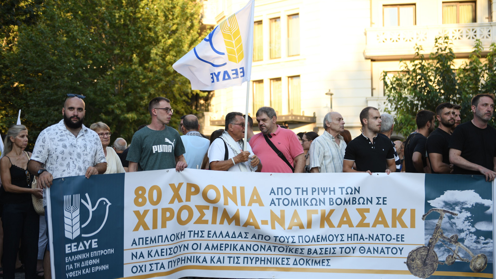 «Η Ελληνική Επιτροπή για τη Διεθνή Ύφεση και Ειρήνη (ΕΕΔΥΕ) καταγγέλλει το μεγαλύτερο έγκλημα του ιμπεριαλισμού: τη ρίψη των ατομικών βομβών από τις ΗΠΑ στη Χιροσίμα και στο Ναγκασάκι, στις 6 και 9 Αυγούστου 1945, και τιμά τη μνήμη των εκατοντάδων χιλιάδων θυμάτων.
