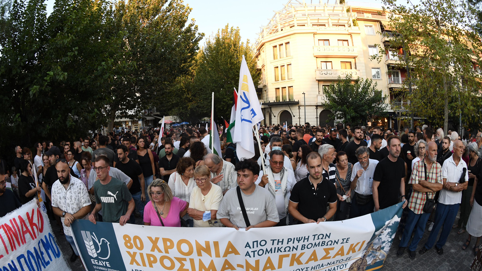 Πλήθος κόσμου έχει συγκεντρωθεί κάτω από τον Ιερό Βράχο της Ακρόπολης, ανταποκρινόμενο στο κάλεσμα της ΕΕΔΥΕ, με αφορμή τη συμπλήρωση 80 χρόνων από τη ρίψη ατομικών βομβών σε Χιροσίμα και Ναγκασάκι.