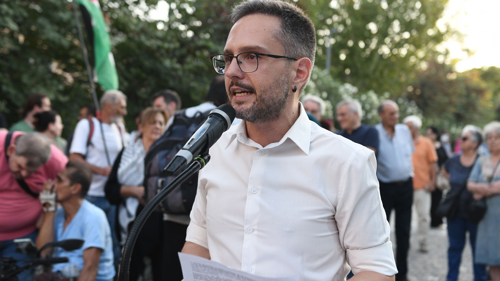 Στην κινητοποίηση απεύθυνε χαιρετισμό ο ο Μοχάμεντ Ικνάιμπι, εκ μέρους της Γενικής Ένωσης Παλαιστινίων Εργατών Ελλάδος.