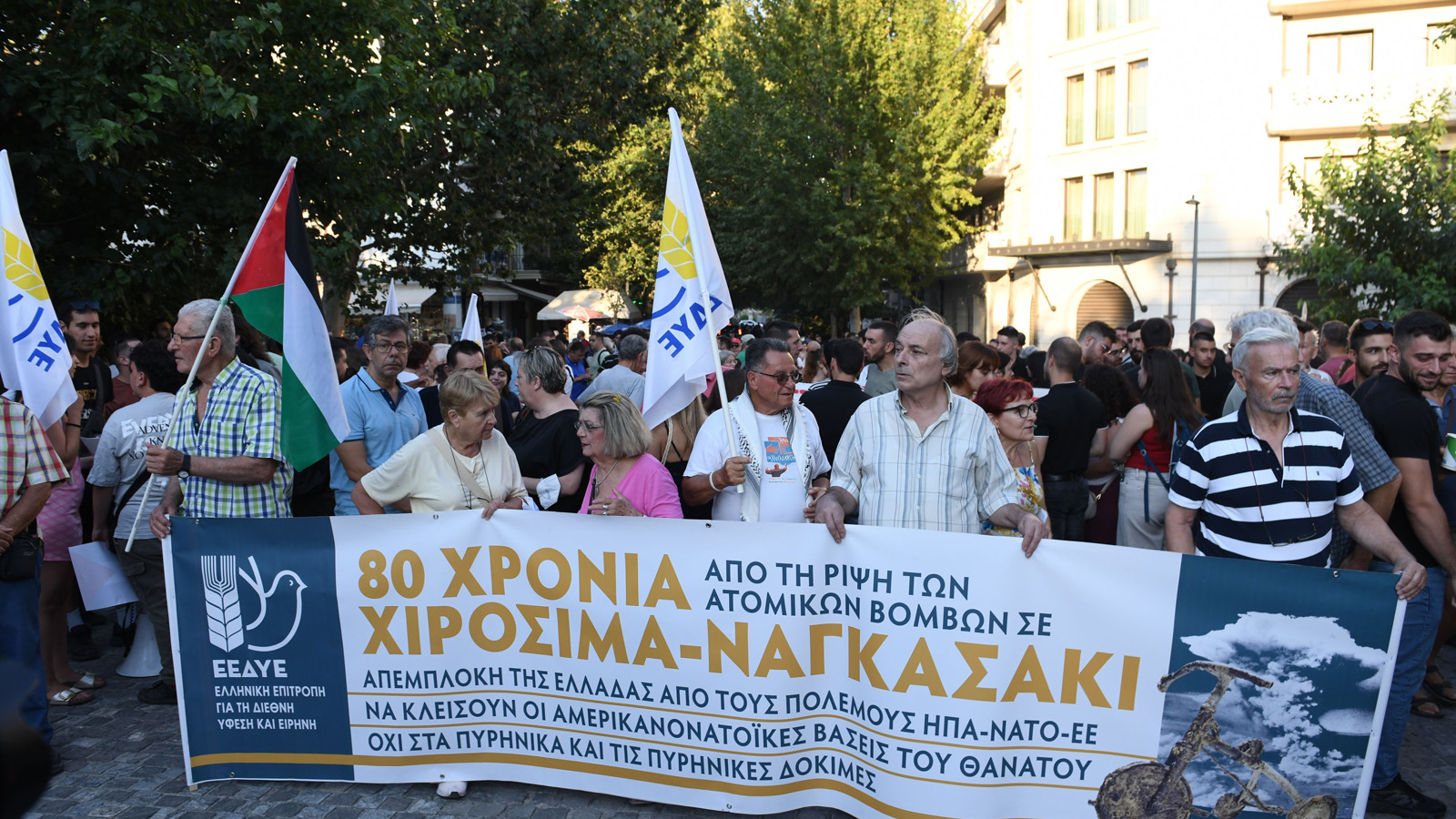 Έξω από τα γραφεία της ΕΕ έφτασε και κατέληξε η μεγάλη αντιιμπεριαλιστική πορεία της Ελληνικής Επιτροπής για την Διεθνή Ύφεση και Ειρήνη στο κέντρο της Αθήνας, όπου οι διαδηλωτές θυροκόλλησαν το ψήφισμα της ΕΕΔΥΕ για τη συμπλήρωση των 80 χρόνων από τη ρίψη ατομικών βομβών σε Χιροσίμα και Ναγκασάκι.